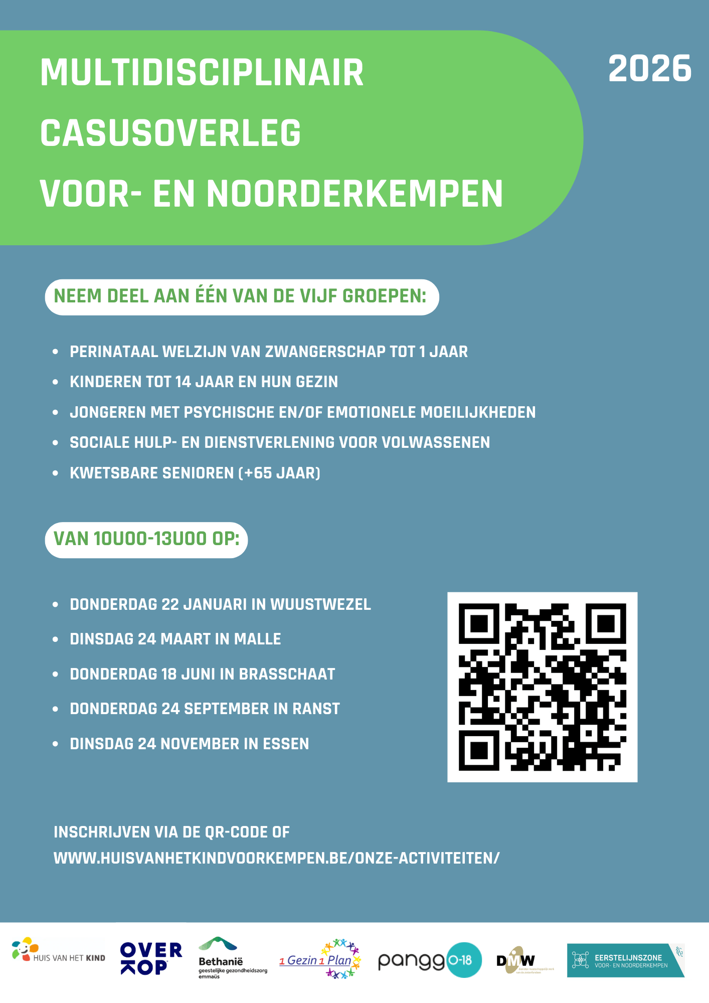 In de regio Voor- en Noorderkempen worden er in 2026 op verschillende momenten op verschillende locaties casusoverleggen georganiseerd. Deze gaan steeds door van 10u00-13u00 met van 12u00-13u00 een netwerkmoment met lunch. Je schrijft je per bijeenkomst in via onderstaande linken.