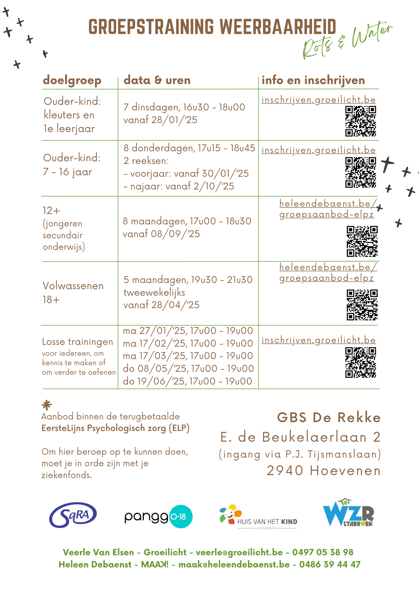 De groepssessies gaan door van 17u15 tot 18u45 in de turnzaal van GBS De Rekke te Hoevenen (ingang via Pieter Jozef Tijsmanslaan, parking aan de Blokwegvelden) op volgende momenten: