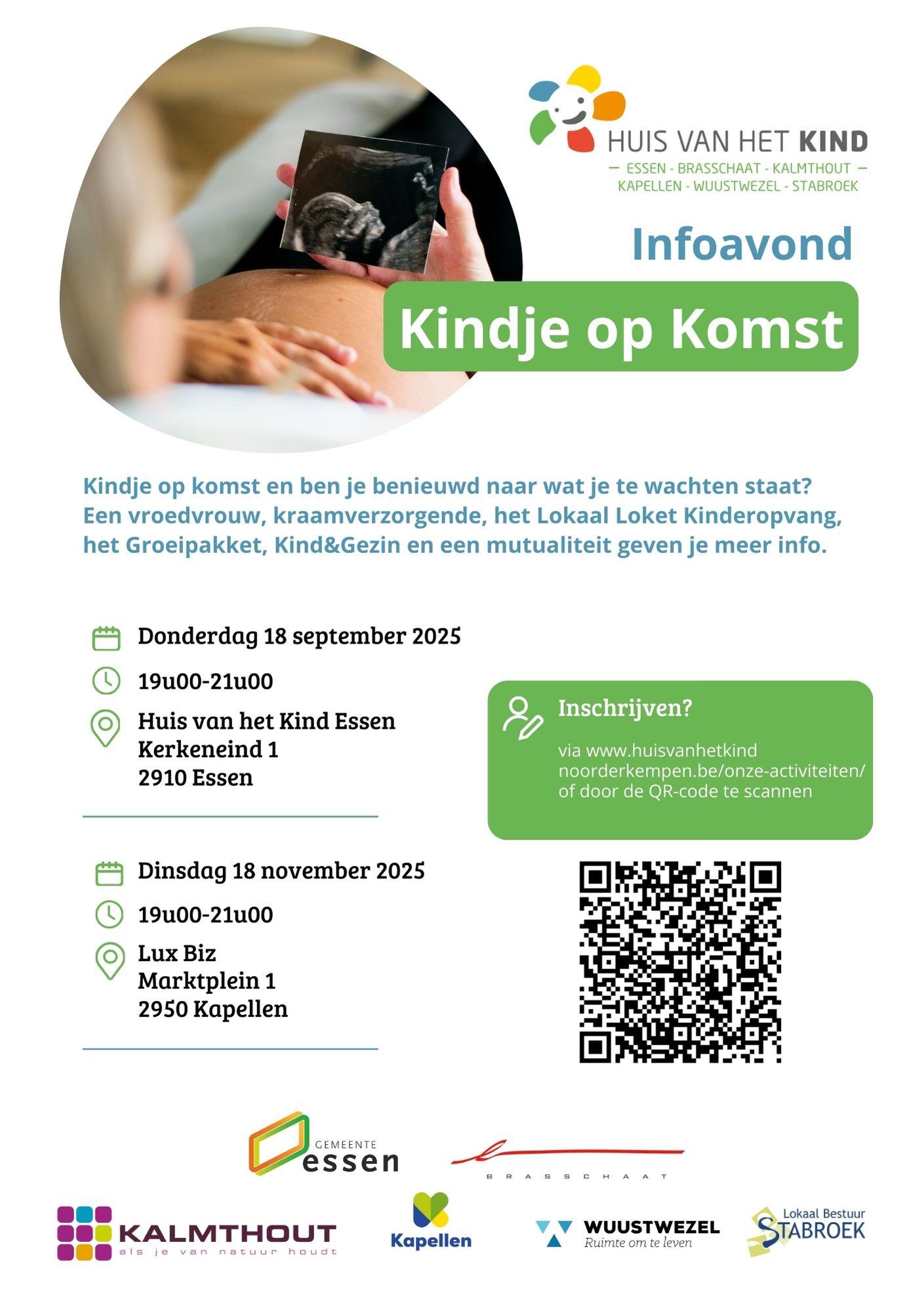 Tijdens de infoavond "Kindje op Komst" krijg je een antwoord op al je vragen, twijfels en bezorgdheden. Verschillende organisaties (vroedvrouw, kraamzorg, Groeipakket, Kind&Gezin en mutualiteit) zijn aanwezig om je meer informatie te geven over alle fasen van de zwangerschap tot de geboorte.